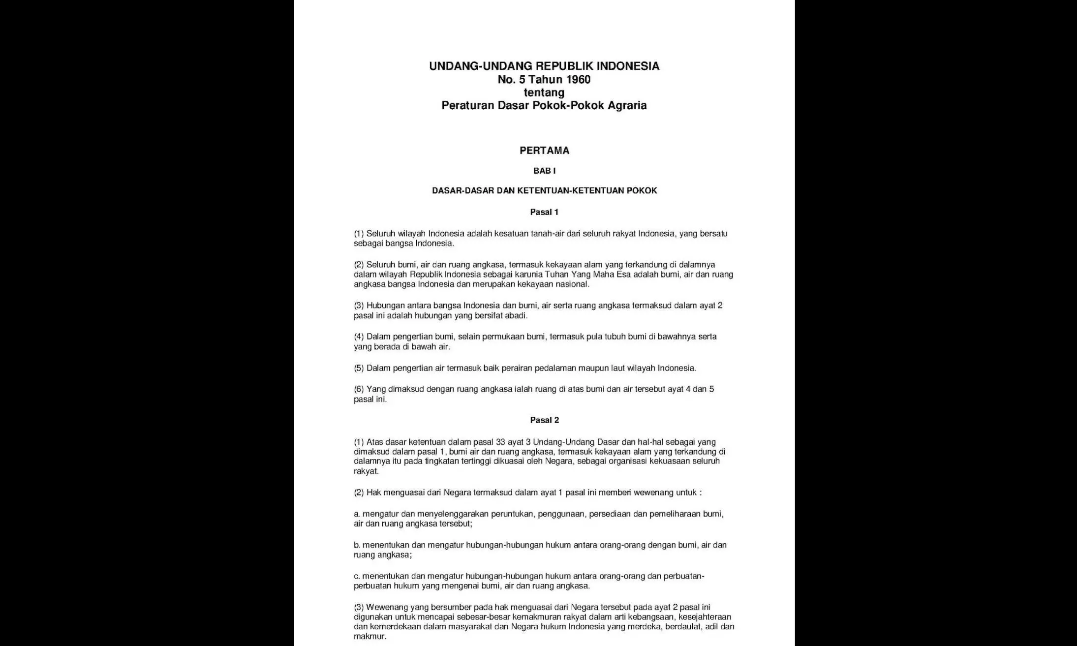 Halaman depan Undang-Undang Nomor 5 Tahun 1960 (UUPA), dasar hukum pembentukan kebijakan agraria nasional. (Wikimedia Commons)