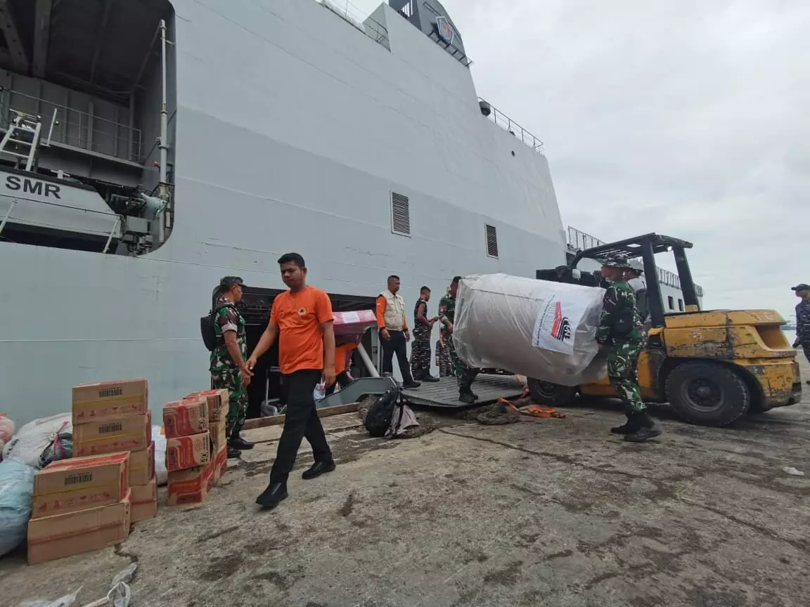 Kementerian Koordinator Infrastruktur dan Pembangunan Kewilayahan mengirimkan bantuan logistik serta tim ahli untuk mempercepat penanganan dampak banjir bandang dan longsor di wilayah utara Sumatera melalui Pelabuhan Belawan Medan. Foto : Radio Elshinta Endang Suddrajat