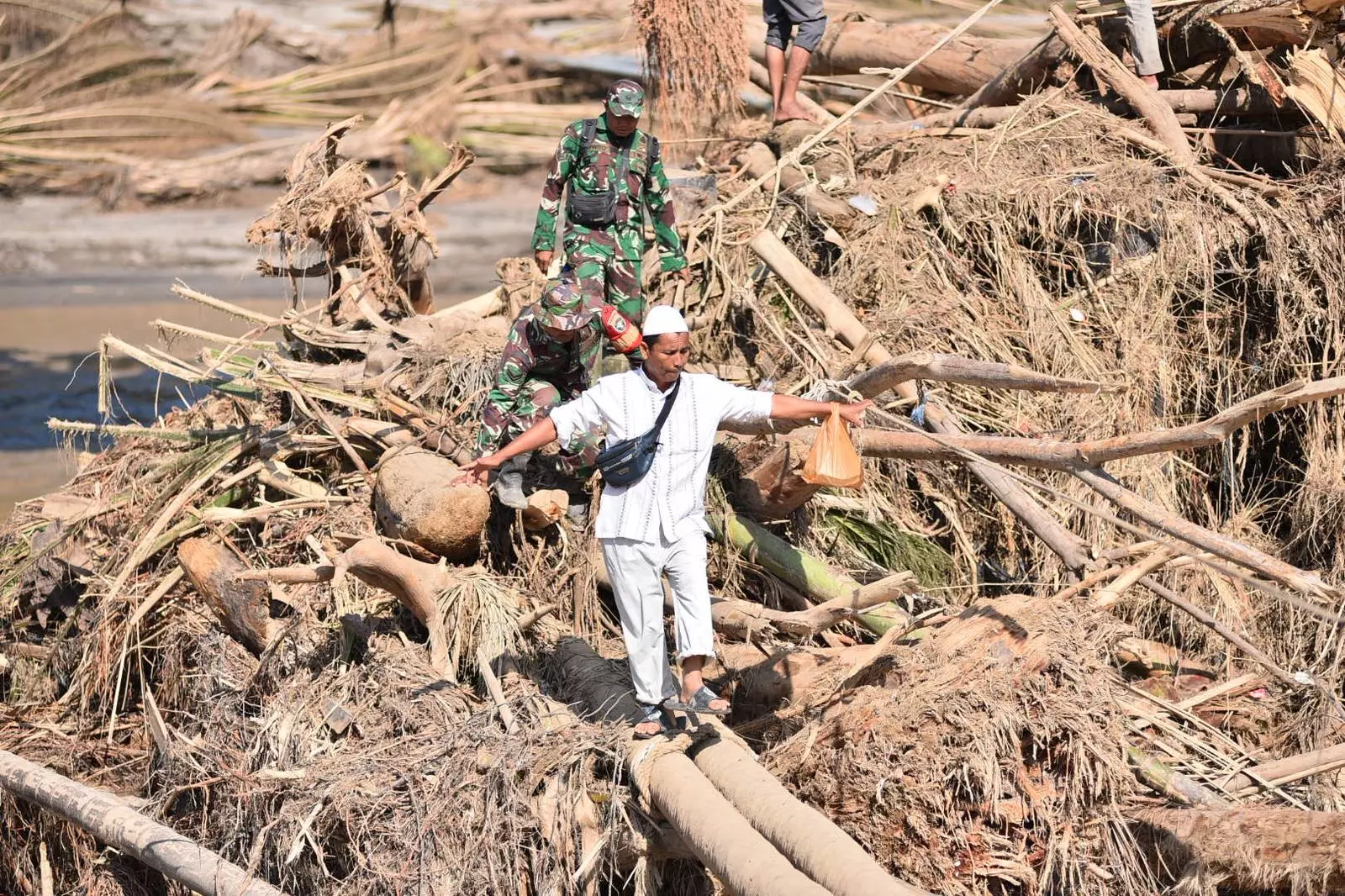 Derasnya arus dan tumpukan material banjir berupa kayu, lumpur, serta bebatuan menutup alur sungai sehingga jalur penghubung antar desa tidak dapat dilewati. TNI memprioritaskan anak-anak, lansia, dan perempuan untuk diseberangkan lebih dulu.