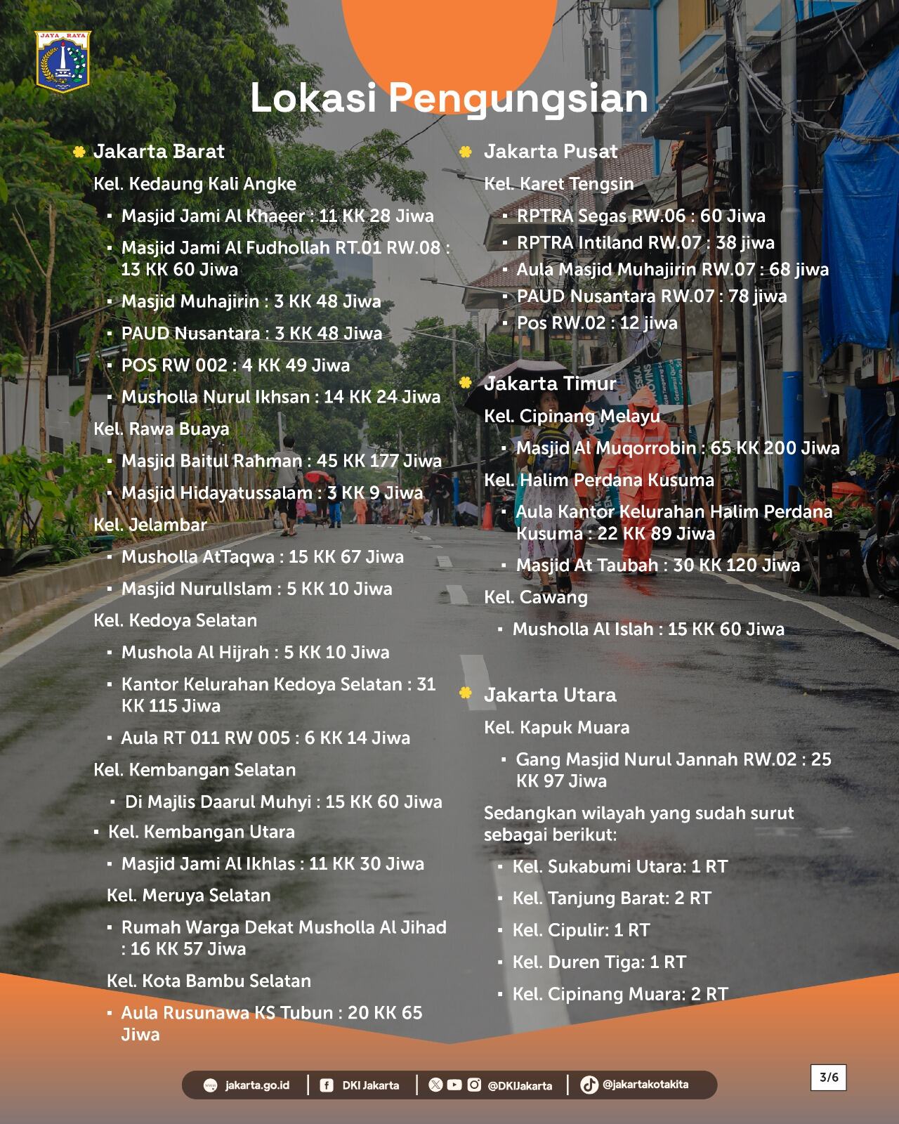 BPBD mencatat sejumlah titik pengungsian telah disiapkan, terutama di Jakarta Barat, Jakarta Pusat, Jakarta Timur, dan Jakarta Utara. Lokasi pengungsian memanfaatkan masjid, musholla, aula kelurahan, RPTRA, hingga rusunawa.