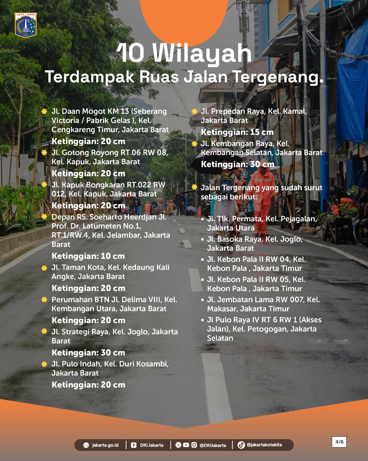 Sebanyak 10 ruas jalan dilaporkan masih tergenang banjir, dengan ketinggian air antara 10 hingga 30 sentimeter. Beberapa di antaranya: