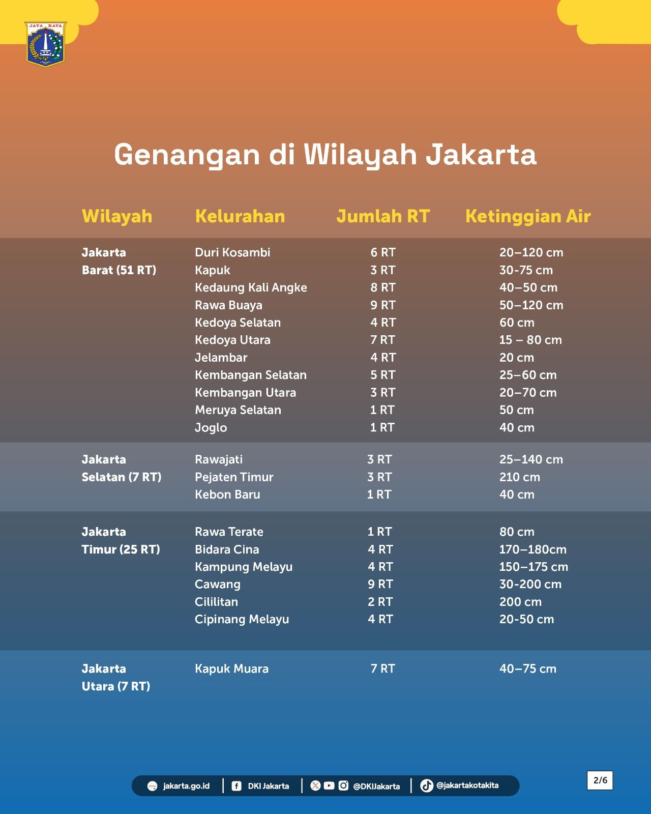 Sementara itu, Jakarta Timur mencatat 25 RT tergenang, tersebar di enam kelurahan. Ketinggian air di wilayah ini berkisar antara 20 hingga 200 sentimeter, dengan dampak terparah terjadi di Bidara Cina, Kampung Melayu, Cawang, dan Cililitan akibat luapan Kali Ciliwung.