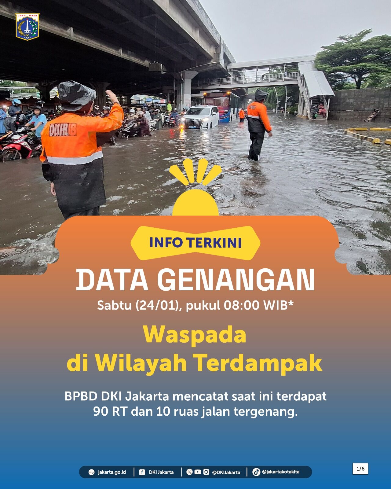 Hujan deras yang mengguyur wilayah DKI Jakarta dan sekitarnya sejak Kamis (22/1/2026) menyebabkan genangan di sejumlah wilayah. Hingga Sabtu (24/1/2026) pukul 08.00 WIB, Badan Penanggulangan Bencana Daerah (BPBD) DKI Jakarta mencatat 90 RT dan 10 ruas jalan masih tergenang banjir.