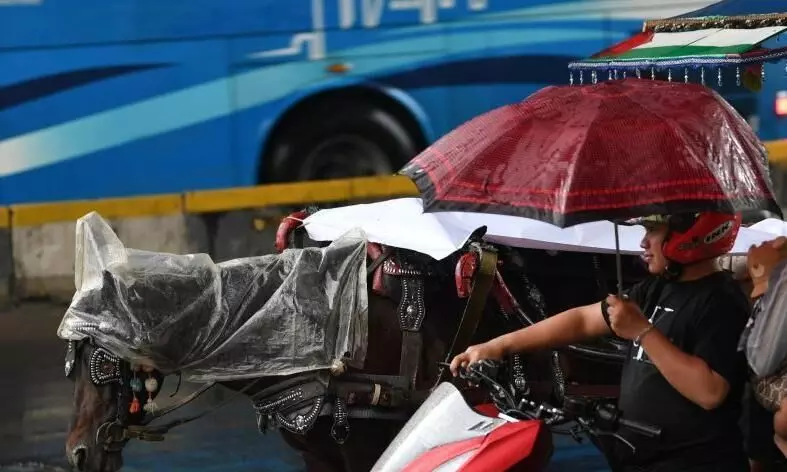 Seorang pengendara melintas di samping seekor kuda delman yang badannya ditutup menggunakan plastik saat hujan di Jakarta, Jumat (19/12/2025). BMKG menyebut Siklon Tropis Bakung, Bibit Siklon Tropis 93S, dan Bibit Siklon Tropis 95S terpantau berada di sekitar wilayah Indonesia dan belum masuk ke daratan dan berdampak pada peningkatan potensi hujan dan angin kencang di sejumlah wilayah termasuk Jakarta. ANTARA FOTO/Wahyu Putro A/nym.