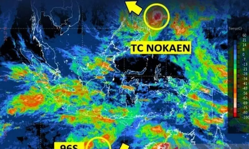 Peta pergerakan Siklon Tropis Nokaen yang terpantau berada di sekitar 10,3 derajat Lintang Utara dan 128,8 derajat Bujur Timur di Laut Filipina, sebelah utara Maluku Utara oleh Badan Meteorologi Klimatologi dan Geofisika (BMKG) Kamis (15/1/2026). Siklon tersebut bergerak dengan kecepatan angin maksimum mencapai 30 knot atau sekitar 56 kilometer per jam serta tekanan minimum 1.000 hPa. ANTARA/HO-BMKG/am.