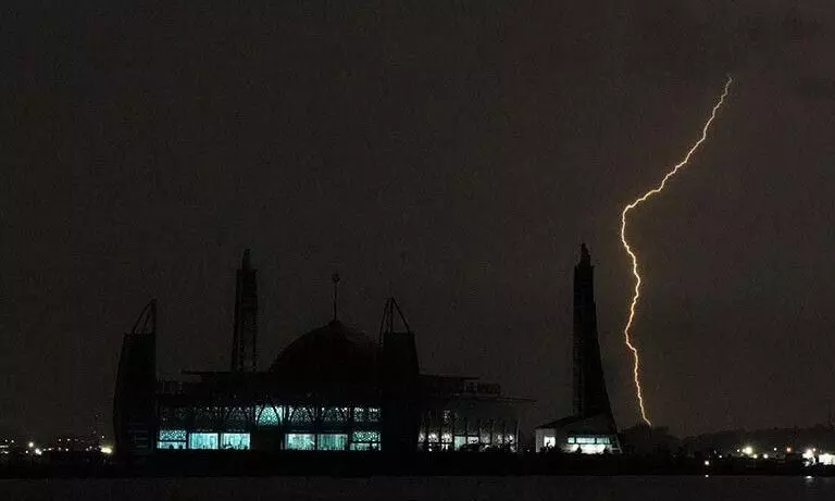 Kilatan petir di atas langit areal Masjid Al Alam di Teluk Kendari, Kendari, Sulawesi Tenggara, Senin (20/2/2023). Badan Meteorologi Klimatologi dan Geofisika mengimbau agar masyarakat mewaspadai potensi munculnya petir saat hujan serta angin kencang di wilayah Sulawesi Tenggara. ANTARA FOTO/Jojon/tom/pri.