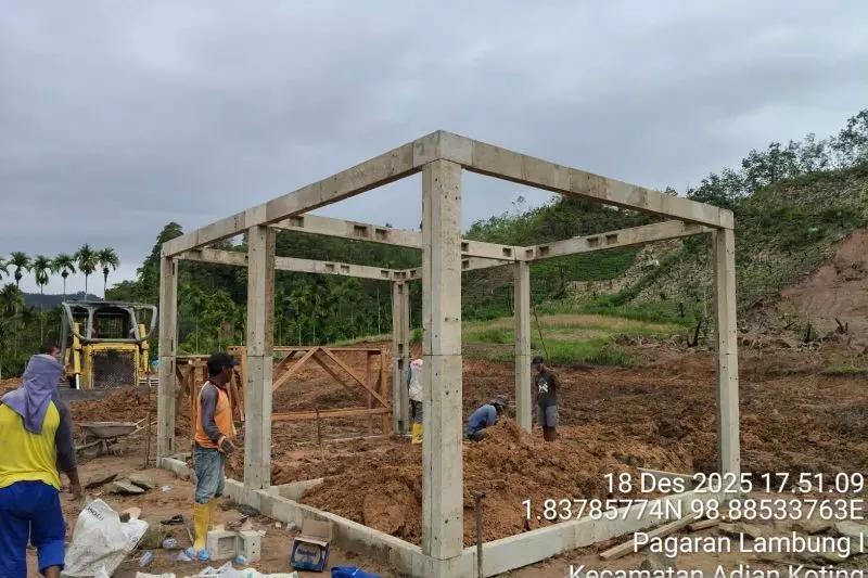 Petugas mengerjakan pembangunan rumah hunian sementara (huntara) sekaligus yang menjadi model standar bangunan rumah hunian tetap (huntap) di Desa Sibalanga, Kecamatan Adian Koting, Kabupaten Tapanuli Utara, Kamis (18/12/2025). ANTARA/HO-BNPB