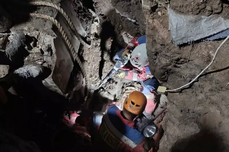 Petugas pemadam kebakaran saat mengevakuasi dua korban tertimbun tanah saat hendak mencari harga karun di Kecamatan Antapani, Bandung, Jawa Barat, Jumat (5/2/2026). ANTARA/HO-Diskarmatan Kota Bandung