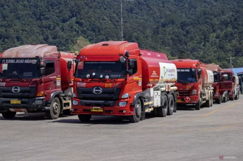 Sejumlah truk pengangkut bahan bakar minyak bersiap membawa bahan bakar dari Integrated Terminal Teluk Kabung, Kota Padang, Sumatera Barat. ANTARA/Muhammad Zulfikar