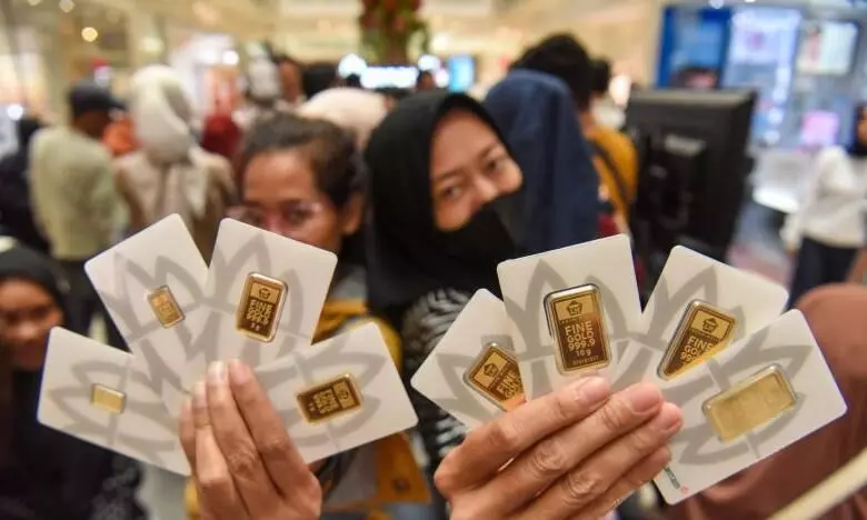 Pengunjung menunjukkan logam mulia Antam yang baru dibeli di Jakarta, Jumat (27/3/2026). ANTARA FOTO/Indrianto Eko Suwarso/wpa.
