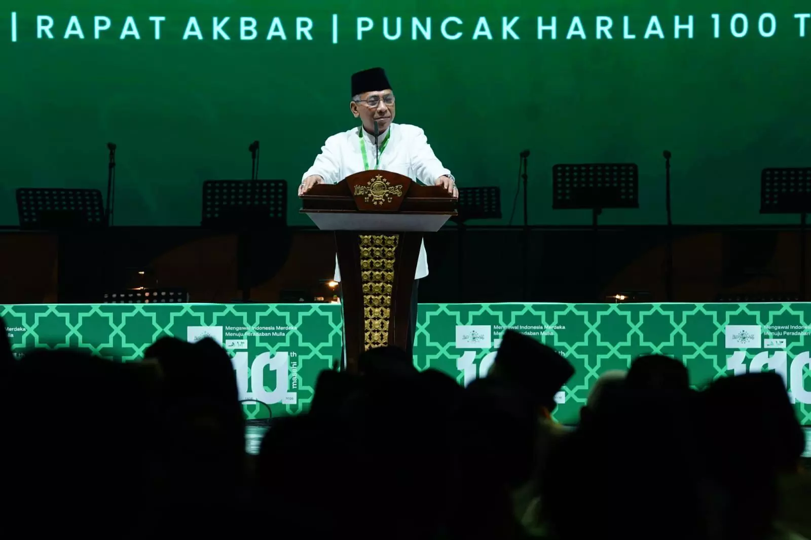 “Hari lahir seratus tahun Masehi Nahdlatul Ulama, sebagai Nahdlatul Ulama yang satu, Alhamdulillah, sebagaimana disepakati oleh Pengurus Besar Nahdlatul Ulama sejak Agustus 2025 dalam rapat gabungan yang digelar, bahwa peringatan hari lahir Nahdlatul Ulama kali ini mengusung tema Mengawal Indonesia Merdeka Menuju Peradaban Mulia,” ujar Gus Yahya.