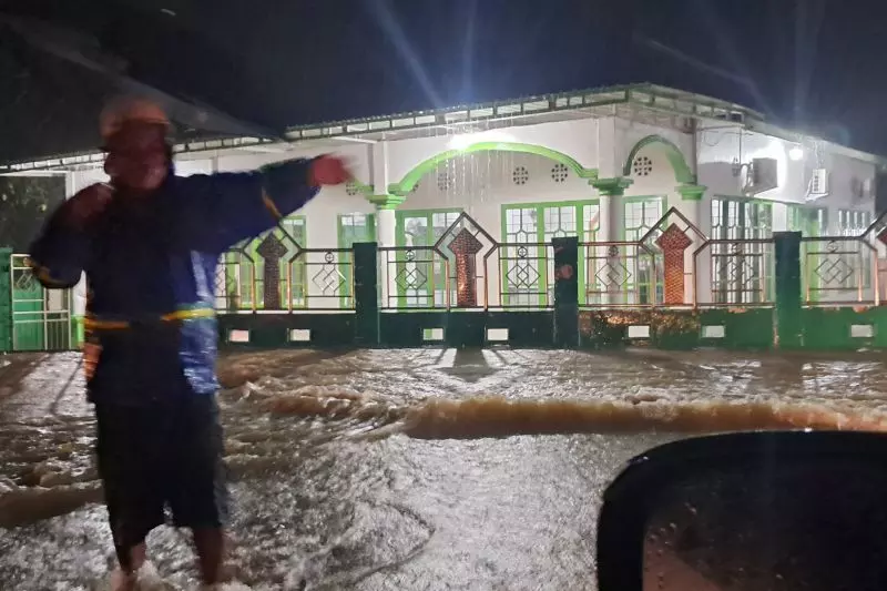 Seorang warga lokal Kabupaten Barru, Sulawesi Selatan memandu pengguna jalan agar tidak melintas ke area jalan yang terendam banjir di Barru, Minggu malam (26/10/2025). ANTARA/Nur Suhra Wardyah