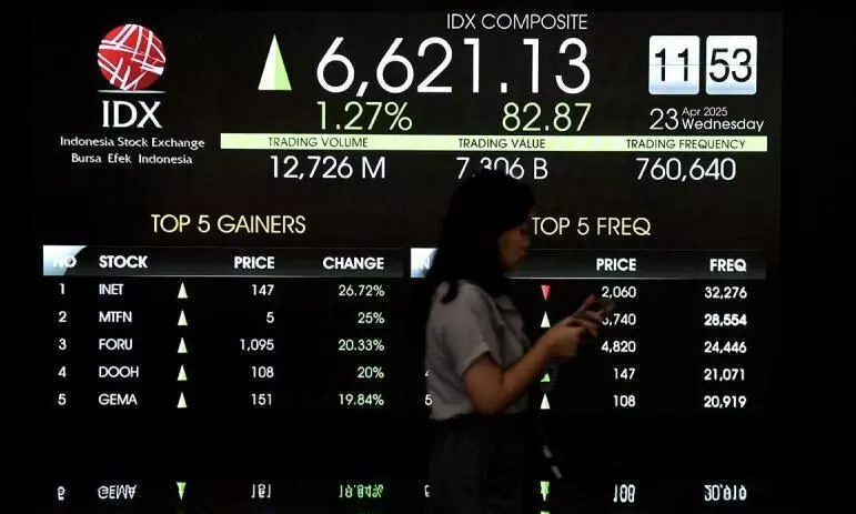 Pekerja melintasi layar digital pergerakan Indeks Harga Saham Gabungan (IHSG) di Bursa Efek Indonesia (BEI), Jakarta, Rabu (23/4/2025). IHSG ditutup menguat 90,16 poin atau 0,0138 persen di level 6628,426 pada penutupan perdagangan Rabu (23/4/2025). ANTARA FOTO/Muhammad Adimaja/rwa/pri. (ANTARA FOTO/MUHAMMAD ADIMAJA)
