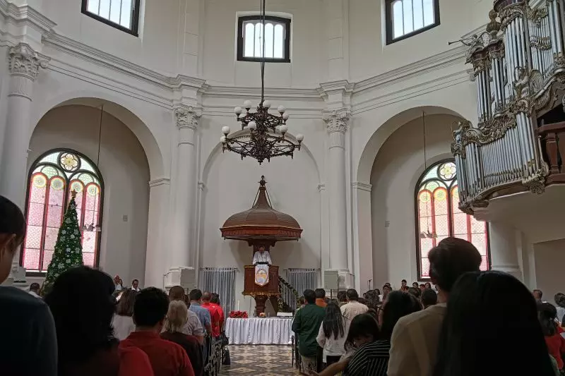 Jemaat kristiani melaksanakan ibadah misa Natal di Gereja Blenduk Semarang, Kamis (25/12/2025). ANTARA/Zuhdiar Laeis