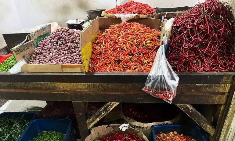 Cabai rawit merah, cabai merah keriting, dan bawang merah dijual pedagang di Pasar Rumput, Jakarta. ANTARA/Harianto