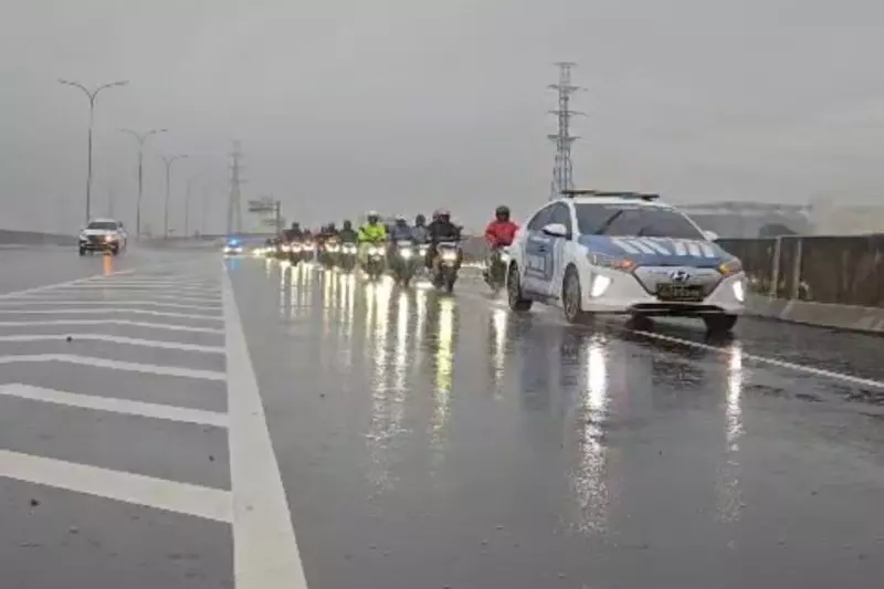 Korps Lalu Lintas (Korlantas) Polri melalui Unit Patroli Jalan Raya (PJR) Tol Jakarta-Cikampek membantu pengawalan ratusan pemotor yang melewati jalan tol di Bekasi, Jawa Barat, pada Senin (12/1/2026). ANTARA/HO-Induk PJR Cikampek Korlantas Polri.