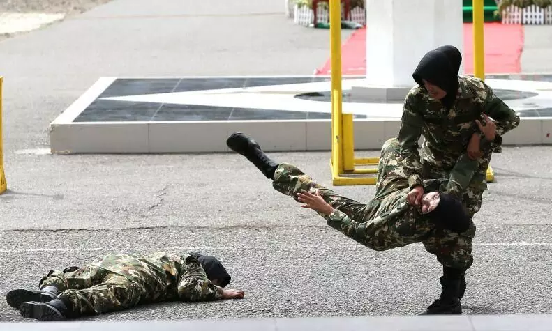 Siswi program Sarjana Penggerak Pembangunan Indonesia (SPPI) menampilkan atraksi bela diri pada penutupan pendidikan dasar militer dan pelatihan manajerial serta penetapan kompenen cadangan (komcad) SPPI Batch-3 tahun 2025 di lapangan Blangpadang, Banda Aceh, Aceh, Sabtu (12/7/2025). Sebanyak 1.195 orang yang merupakan bagian dari 30.018 siswa SPPI di seluruh Indonesia telah mengikuti pelatihan di Resimen Induk Kodam (Rindam) Iskandar Muda selama tiga bulan untuk memperkuat program Makan Bergizi Gratis (MBG) di 23 kabupaten/kota Provinsi Aceh. ANTARA FOTO/Irwansyah Putra/nym. (ANTARA FOTO/IRWANSYAH PUTRA)