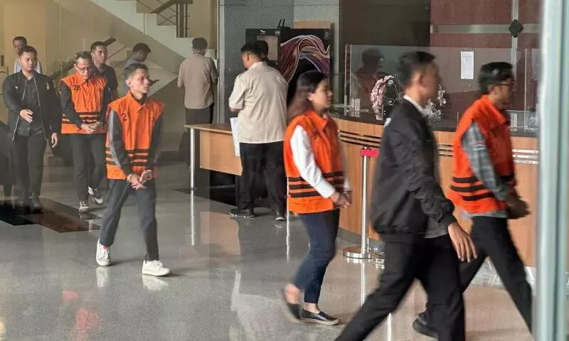 Empat dari delapan tersangka kasus dugaan pemerasan izin kerja tenaga kerja asing di Kemenaker, yang baru ditahan oleh Komisi Pemberantasan Korupsi saat berjalan menuju ruang konferensi pers, di Gedung Merah Putih KPK, Jakarta, Kamis (24/7/2025). (ANTARA/Rio Feisal)