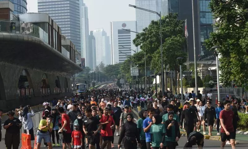 Warga berolahraga saat Hari Bebas kendyaraan Bermotor (HBKB) di kawasan Bundaran HI, Jakarta, Minggu (12/10/2025). Pemprov DKI Jakarta berencana melakukan pemetaan titik-titik strategis untuk pelaksanaan Car Free Day atau HBKB di lima wilayah administrasi yang didasarkan pada data kualitas udara sebagai upaya pengendalian polusi udara di ibu kota. ANTARA FOTO/Indrianto Eko Suwarso/agr
