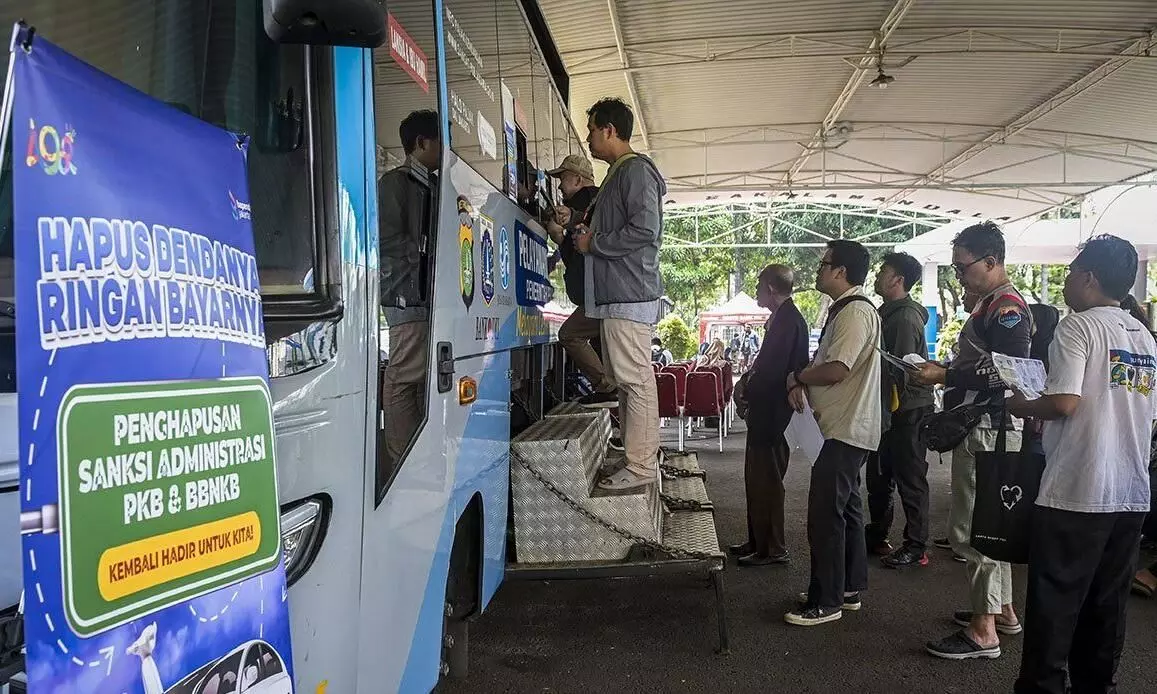 Arsip foto - Warga mengantre untuk melakukan pembayaran pajak kendaraan bermotor di lokasi layanan Samsat Keliling, Polda Metro Jaya, Jakarta, Senin (16/6/2025). ANTARA FOTO/Sulthony Hasanuddin/tom/pri.