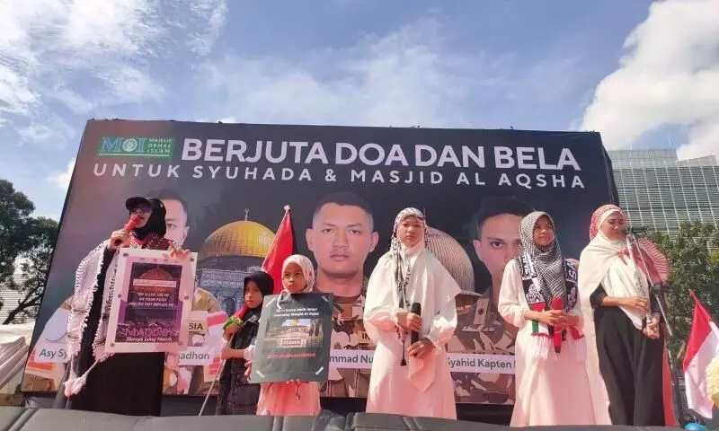 Ribuan massa aksi bertajuk "Berjuta Doa untuk Syuhada" itu mengenakan pakaian berupa gamis yang mayoritas berwarna putih dengan atribut Indonesia dan Palestina.