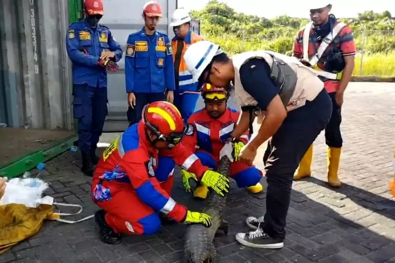 Disdamkarmat Kotim bersama Komunitas Reptil Sampit mengevakuasi seekor trenggiling yang terkurung dalam peti kemas di TPK Bagendang, Rabu (1/1/2025). ANTARA/HO-Pelindo TPK Bagendang