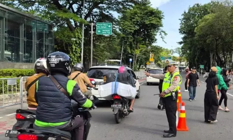 Direktorat Lalu Lintas (Ditlantas) Polda Metro Jaya mengerahkan ratusan personel untuk mengamankan lalu lintas saat puncak perayaan Imlek Nasional di Lapangan Banteng, Jakarta Pusat.