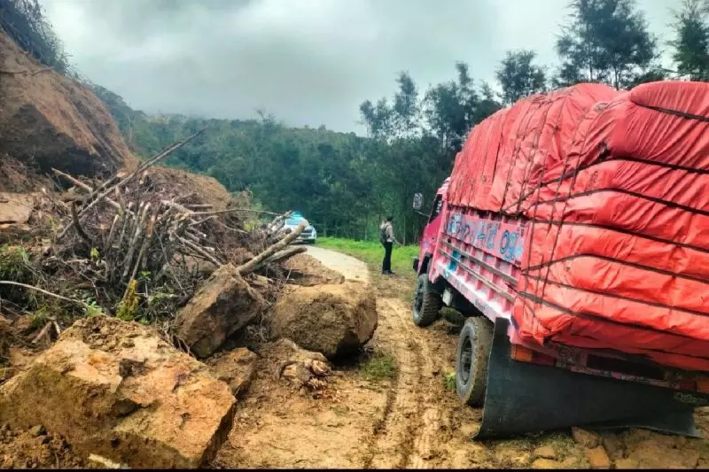 Situasi longsor di Kampung Yuta, Distrik Gelok Beam, Kabupaten Lanny Jaya menyebabkan sebagian besar badan jalan tertutup timbunan tanah. ANTARA