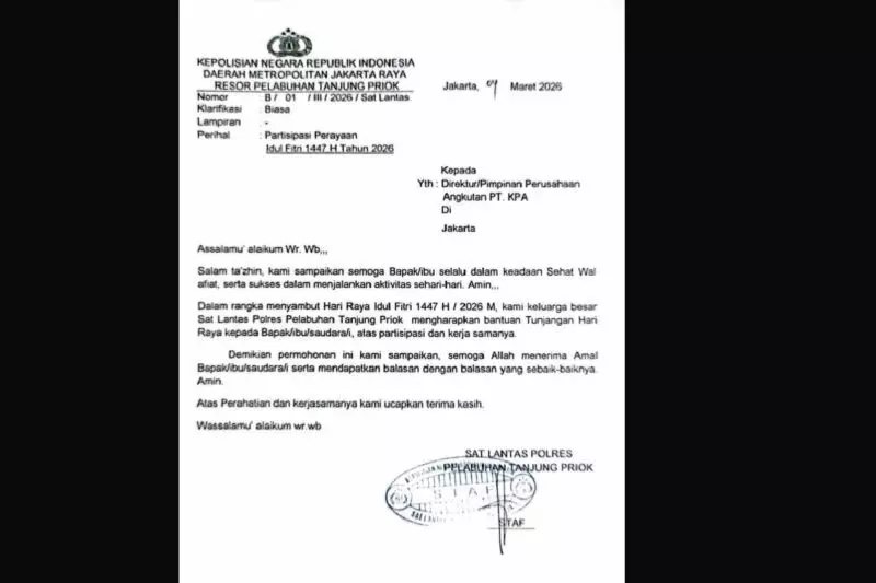 Polres Kawasan Pelabuhan Tanjung Priok, Jakarta Utara membantah melayangkan surat permintaan bantuan Tunjangan Hari Raya Idul Fitri 1447 Hijriah kepada Asosiasi Pengusaha Truk Indonesia (Aptrindo) melalui foto surat yang beredar luas di sejumlah platform media sosial.