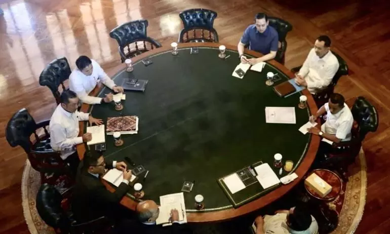 Presiden Prabowo Subianto menerima laporan dari jajaran menteri mengenai berbagai isu, termasuk perkembangan pembangunan kampung haji Indonesia dalam rapat terbatas di kediaman pribadi Presiden, Bukit Hambalang, Kabupaten Bogor, Jawa Barat, Selasa (23/12/2025). ANTARA/HO-BPMI Sekretariat Presiden.