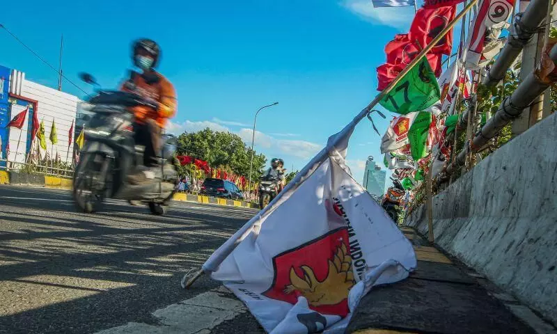 Sebuah bendera salah satu partai politik terjatuh menutupi sebagian jembatan layang Pasar Senen, Jakarta (20/1/2024). ANTARA FOTO/Jhogy Nabhasa Siahaan/app/nz.