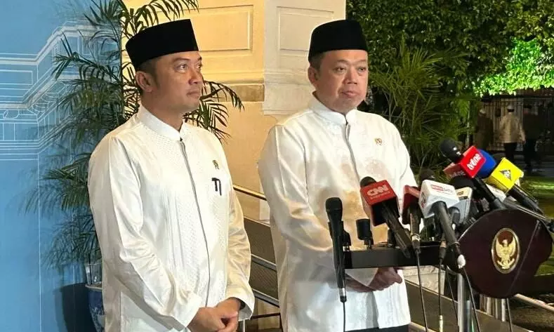 Menteri Agraria dan Tata Ruang/Kepala Badan Pertanahan Nasional (ATR/BPN) Nusron Wahid (kanan) usai mendampingi Presiden dalam pertemuan dengan para tokoh ulama dan organisasi kemasyarakatan (ormas) Islam di Istana Kepresidenan, Jakarta, Kamis (5/3/2026) malam. ANTARA/Maria Cicilia Galuh