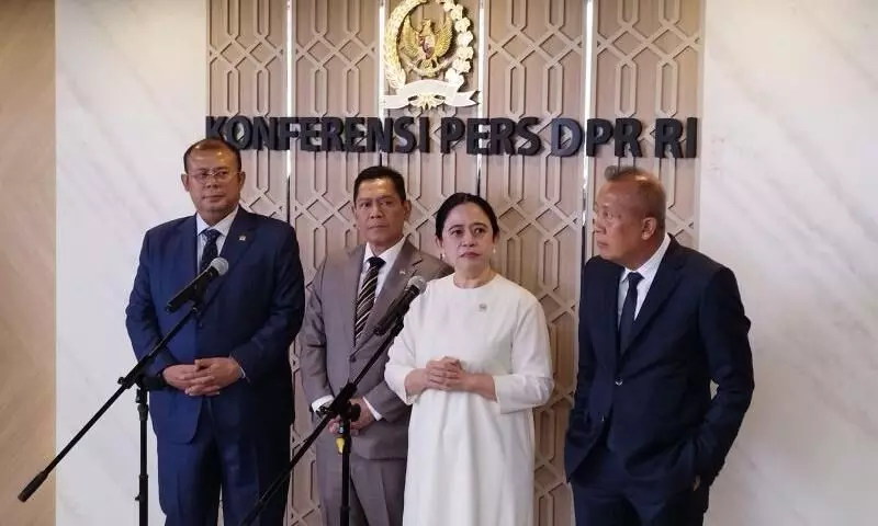 Ketua DPR RI Puan Maharani bersama jajaran pimpinan DPR RI saat konferensi pers di kompleks parlemen, Jakarta, Selasa (13/1/2026). (ANTARA/Bagus Ahmad Rizaldi)