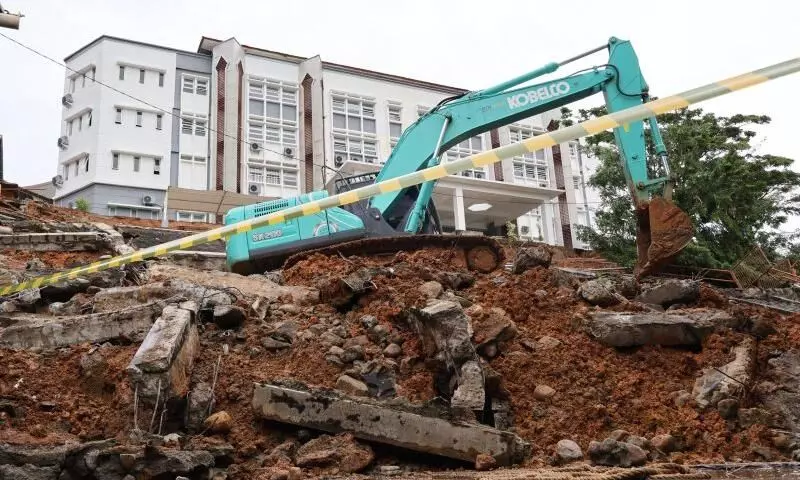 Operator alat berat mengangkat tumpukan material longsor yang menimbun area parkir kampus UIN Imam Bonjol Padang, Sumatera Barat, Selasa (26/11/2025). ANTARA/Muhammad Zulfikar