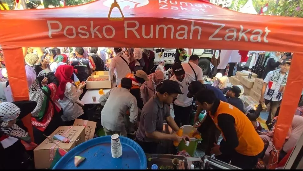 Rumah Zakat berbagi makanan dan minuman kepada ribuan peserta aksi Indonesia lawan Genosida di Palestina