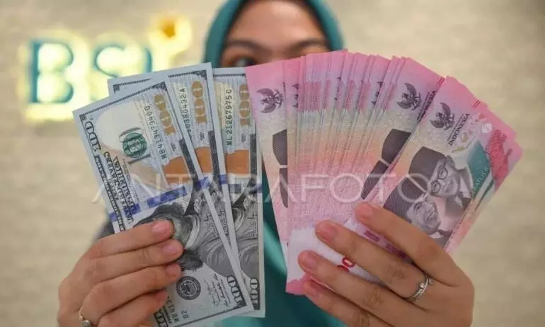 Pegawai menunjukkan uang rupiah dan dolar AS di Bank Syariah Indonesia, Tangerang Selatan, Banten, Rabu (21/1/2026). ANTARA FOTO/Hafidz Mubarak A/wsj