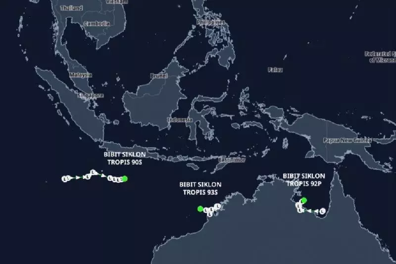 Tangkapan layar yang memperlihatkan posisi tiga bibit siklon tropis di wilayah selatan Indonesia, Rabu (4/3/2026). ANTARA/HO-TCWC Jakarta