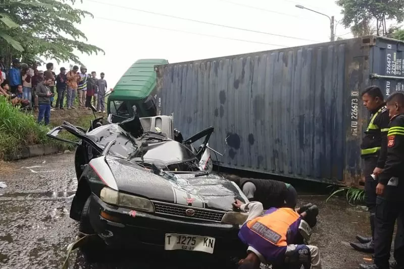 Truk kontainer bernomor polisi B 9107 UEI terguling dan menimpa mobil sedan Toyota Corolla bernomor polisi T1275 KN di Jalan Raya Tanggul Rawagabus, Desa Kondangjaya, Kecamatan Karawang Timur.