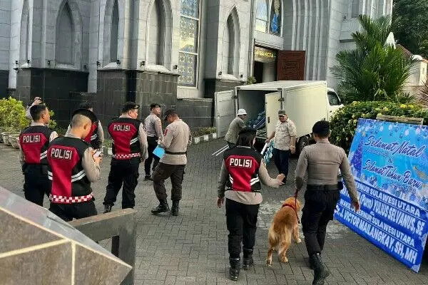 Personel Ditsamapta bersama satwa terlatih yang memiliki kemampuan deteksi bahan peledak (handak), melakukan sterilisasi di lingkungan sekitar gereja, baik di dalam gereja maupun di halaman gereja yang akan menjadi tempat misa malam Natal.