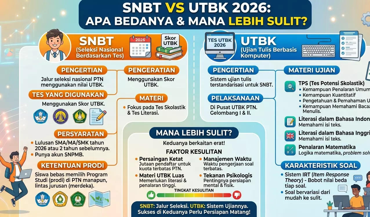 SNBT vs UTBK 2026: Simak perbedaan, tingkat kesulitan, materi, dan tips lolos seleksi masuk perguruan tinggi negeri dengan strategi terbaik.