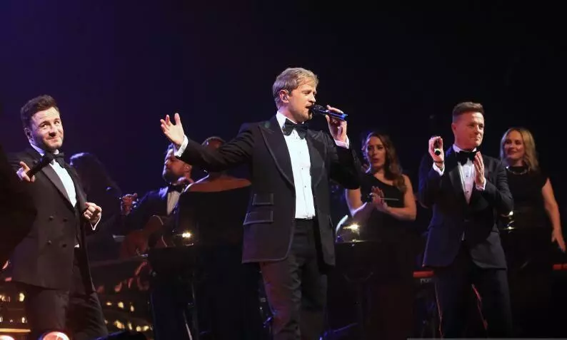 Personel grup vokal Westlife yang terdiri atas Shane Filan (kiri), Kian Egan (tengah), dan Nicky Byrne (kanan) tampil pada konser "Westlife - A Gala Evening" di Nusantara International Convention Exibition (NICE) Pantai Indah Kapuk, Kabupaten Tangerang, Banten, Selasa (10/2/2026). Mereka tampil dengan iringan Magenta Orchestra dalam konser tersebut. (ANTARA FOTO/MUHAMMAD IQBAL)