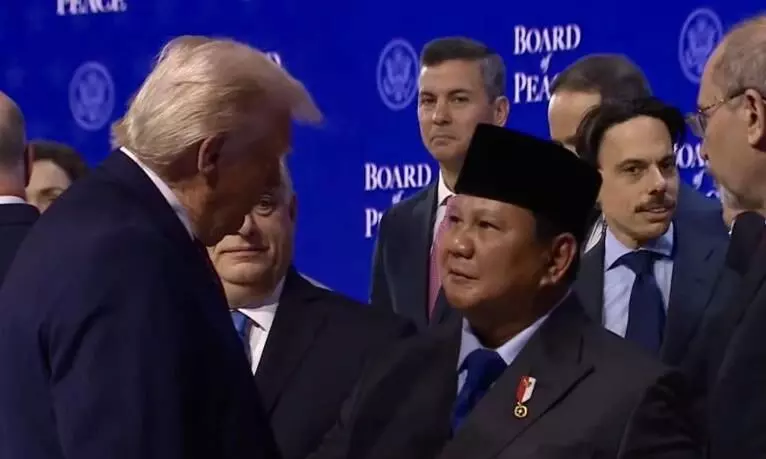Presiden Amerika Serikat Donald J. Trump (kiri) menyalami Presiden Prabowo Subianto (tiga kanan) selepas acara peluncuran Dewan Perdamaian (Board of Peace) Gaza di Congress Hall WEF 2026, Kota Davos, Swiss, Kamis (22/1/2026). ANTARA/HO-White House.