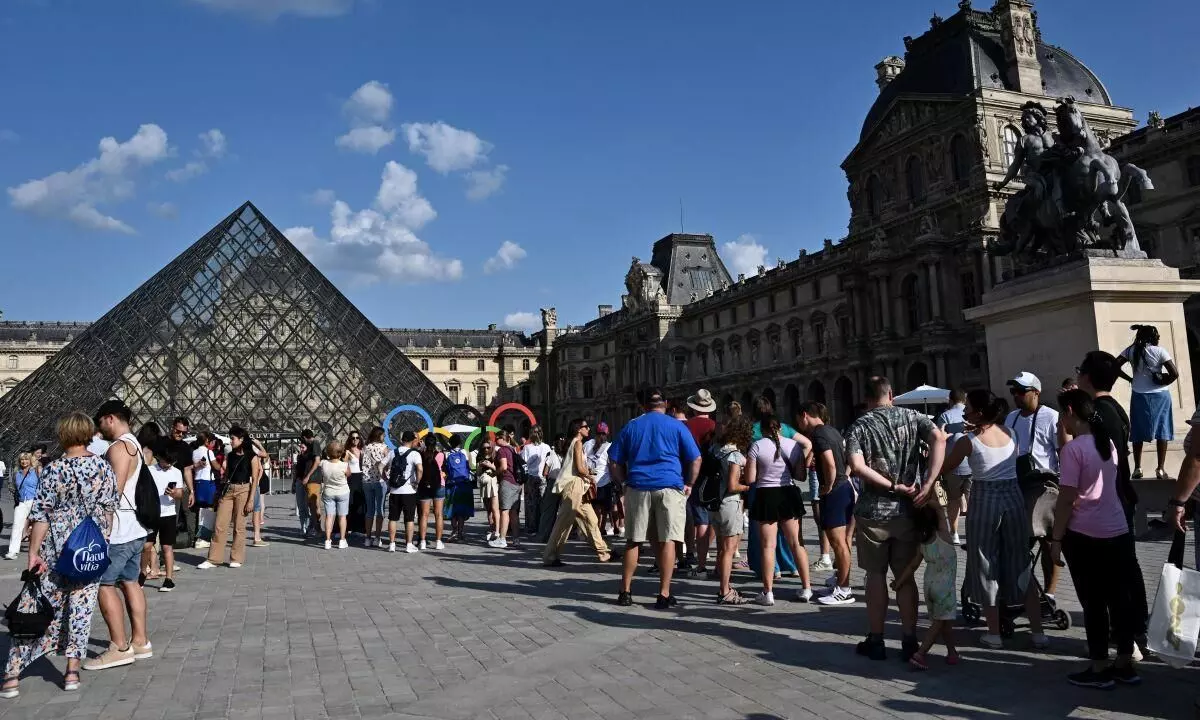 Pengunjung antre berfoto di cincin olimpiade dengan latar belakang Piramida Louvre yang diarsiteki I M Pei di Museum Louvre, Paris, Prancis, Jumat (2/8/2024). ANTARA FOTO/Wahyu Putro A/foc.