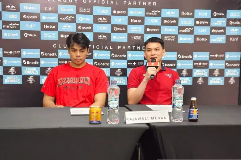 Pemain Rajawali Medan David Ebenezer Frans (kiri) dan asisten pelatih Yosua (kanan) menghadiri jumpa pers setelah pertandingan IBL melawan Bogor Hornbills di GOR Tangkas, Kabupaten Bogor, Sabtu (14/3/2026). (ANTARA/RAUF ADIPATI)