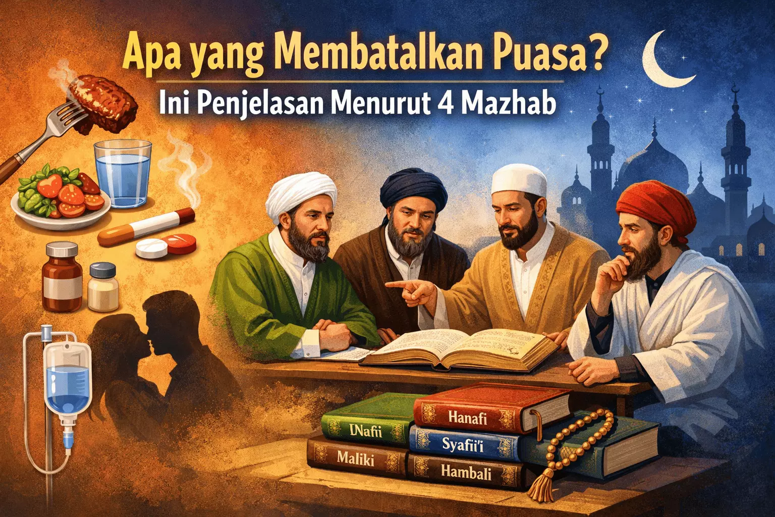 Apa yang membatalkan puasa? Ini penjelasan menurut 4 mazhab untuk jadi pengetahuan penting bagi umat Islam agar ibadah puasa dijalankan secara sah dan sesuai tuntunan syariat. Memahami apa yang membatalkan puasa membantu setiap muslim menghindari kekeliruan yang bisa merusak ibadah. Berdasarkan kajian fikih Islam, empat mazhab besar yaitu Hanafi, Maliki, Syafi’i, dan Hanbali, merumuskan secara rinci berbagai perbuatan yang dapat membatalkan puasa dengan landasan Al-Qur’an, hadis, serta ijtihad para imam mazhab.
