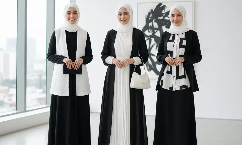 Mengombinasikan outer hitam (misalnya blazer ringan atau kimono panjang) dengan inner putih dapat memberi dimensi visual namun tetap menjaga palet warna monokrom. Gaya ini ideal untuk kamu yang ingin tampil lebih modern namun sopan selama Ramadan dan Hari Raya.