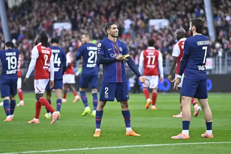 Hakimi melepaskan tendangan keras yang tak mampu dihentikan kiper Brest, menggandakan keunggulan PSG menjadi 2-0 hingga turun minum.