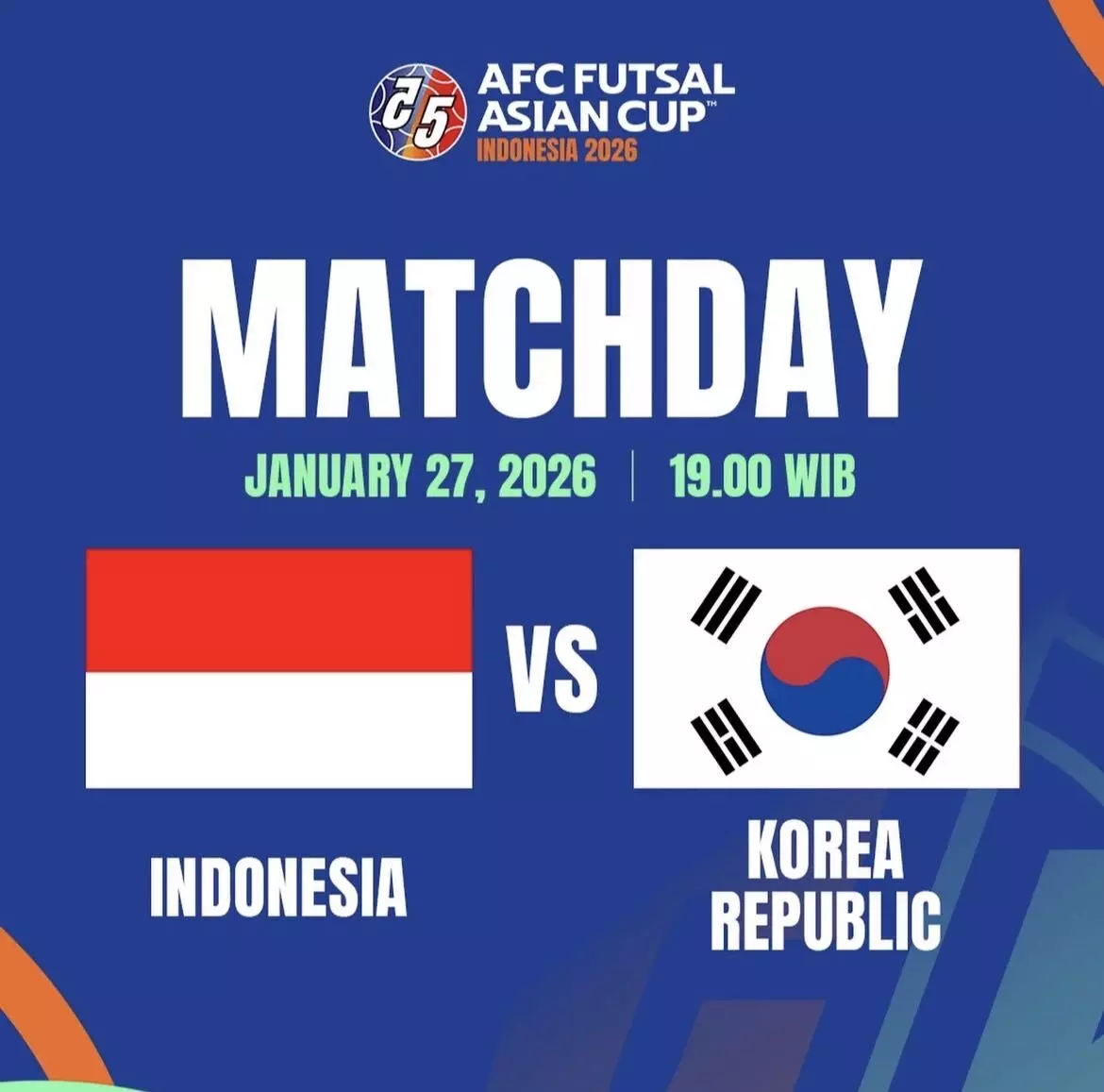 Jakarta — Turnamen AFC Futsal Asian Cup 2026 resmi dimulai hari ini, Selasa (27/1/2026). Laga pembuka mempertemukan Indonesia melawan Korea Republic, yang akan berlangsung di Indonesia Arena pada pukul 19.00 WIB.