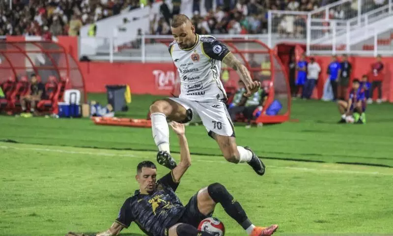 Pesepak Bola Persija Jakarta Gustavo Almeida Dos Santos (atas) berebut bola dengan pesepak bola Malut United Lucas Cardoso Soares (bawah) pada pertandingan BRI Super League 2025/2026 di Stadion Gelora Kie Raha Ternate, Maluku Utara, Selasa (24/2/2026). Persija Jakarta berhasil menang atas tuan rumah Malut United dengan skor 3-2. ANTARA FOTO/Andri Saputra/nz
