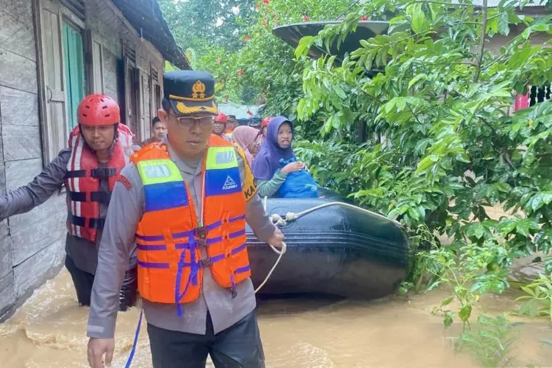 Kapolres Balangan AKBP Yulianor Abdi mengevakuasi beberapa warga setelah banjir bandang surut di Desa Sungsum, Kecamatan Tebing Tinggi, Kabupaten Balangan, Kalimantan Selatan, Sabtu (27/12/2025). ANTARA/Ragil Darmawan.